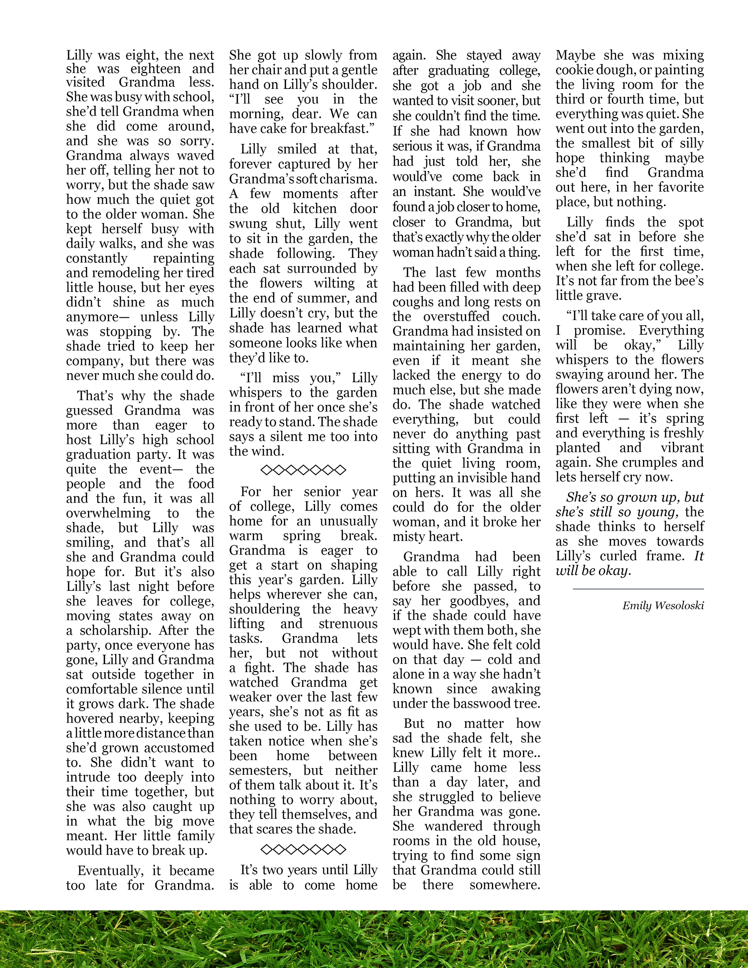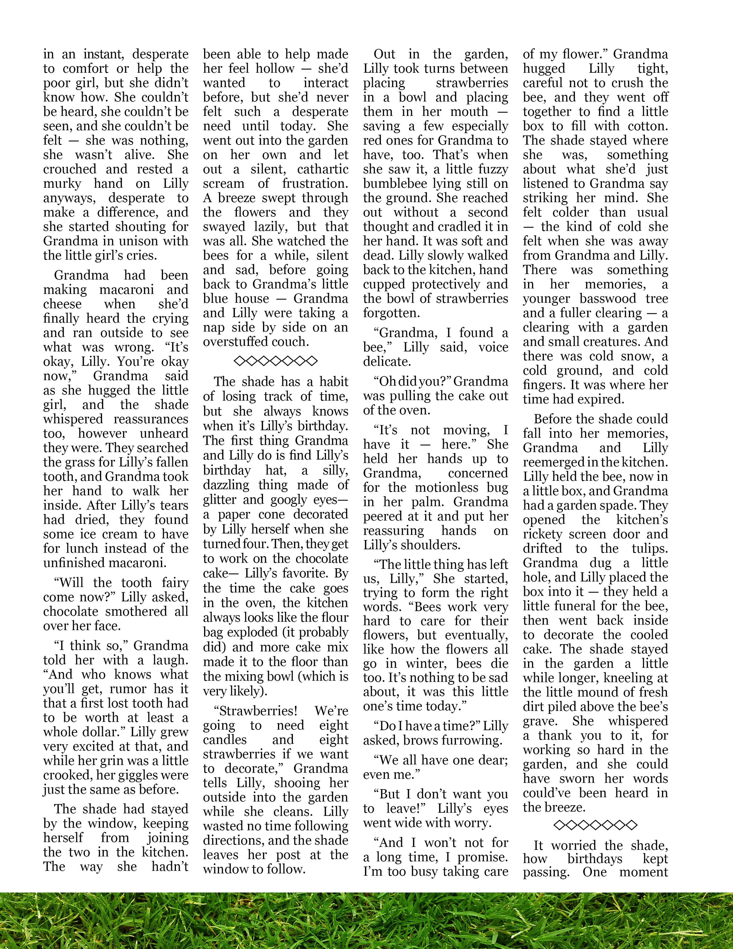 A fictional short story exploring the process of growing up and a young girl's relationship with her mother and grandmother.